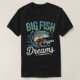 Esta camiseta preta apresenta uma ilustração vibrante de um peixe grande saltando da água azul e branca. As palavras "BIG FISH" são impressas em caracteres grandes, estilizados, com um gradiente de azul e verde no topo. A palavra "Maior" está em uma fonte branca menor e cursiva, e "Sonhos" está em um script branco maior e fluente na parte inferior. Esta design transmite uma mensagem de ambição e de busca de grandes aspirações, provavelmente com um tema de pesca.