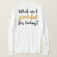 Um dia lembrado para expressar gratidão pelas grandes e pequenas bênçãos que recebemos. À medida que os contamos e os apreciamos, as bênçãos que recebemos regressarão a nós muitas vezes. Apresenta uma inscrição digital de pincel que diz "O que estou grato por hoje" em preto e ouro. ⭐ Arte © JessicaAmber. Para mais roupa de Lei de Atração, visite minha loja zazzle.com/jessicaamberartist 🔵 Para pedidos personalizados, envie-me uma mensagem no Zazzle