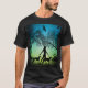 Silhueta de dama andando dois galgos ao anoitecer com cores azul, verde e preta.