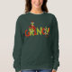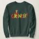 This vibrant and bold graphic is the perfect logo for the holiday mischief-maker! The word "GRINCH!" is displayed in large, stylized letters, primarily in festive red and lime green. The Grinch himself (in his Santa suit) stands right over the letters with his hands on his hips, looking mischievously proud. Beside him, his loyal partner, Max the Dog (complete with reindeer antlers), sits patiently. This fun graphic is a great way to celebrate the iconic characters and their story!