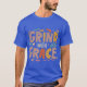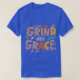 A design da camiseta apresenta a frase "Grind with Grace" em uma fonte ousada e multicolorida. As cores são vibrantes e contrastantes, criando um efeito visualmente marcante. O design é simples, mas impactante, perfeito para um olhar casual e inspirador.