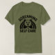 Esta camiseta verde-oliva apresenta um gráfico preto de um gambá largo, gritando, com a boca aberta mostrando os dentes. Linhas archadas sugerem ondas sonoras emanando do gambá. Por cima e por baixo do gambá, o texto "SCREAMING IS SELF CARE" é impresso em caracteres a negrito, ligeiramente angustiados. O design sugere gritos humoramente como uma forma de alivio de estresse.