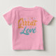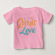 A camiseta ostenta a mensagem divertida "Grande Amor" em um design multicolorido. As cores são brilhantes e alegres, com cada letra potencialmente uma sombra vibrante diferente. A própria fonte poderia ser divertida e caprichosa, complementando a mensagem iluminada.
