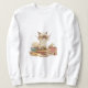Whimsical cat wearing oversized glasses sits on a stack of vintage books; warm watercolor tones and cozy librarian vibe for book lovers and quirky apparel.