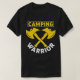 Este design apresenta uma camiseta preta com a palavra "CAMPING" no topo e a palavra "WARRIOR" no fundo. As letras são brancas e o design inclui dois eixos amarelos cruzados.