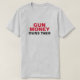 O dinheiro da arma é seu dono e compra não apenas seu silêncio sobre questões de controle de armas, mas também sua disposição de bloquear legislação que nos permitiria pesquisar mortes de armas como fazemos com outras causas de morte e incluir mais dispositivos de segurança e requisitos de seguro. Enquanto mania e obsessão amorosas das armas, e o dinheiro que vem com ela, continuarem a ser aceitáveis em nossa cultura, seus pensamentos e orações para vítimas de violência com armas são completamente sem sentido e inúteis. Design descrição: O design é muito simples porque a mensagem é clara, inequívoca e não requer rico floresce. O texto da frente diz: "O dinheiro da arma é dono deles." O texto posterior diz "#GunControlNow."