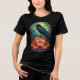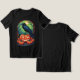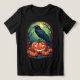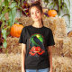 Camisa-T num corvo preto empoleirado sobre um jack-o-lanterna, num pedaço de abóbora, contra árvores assustadoras e uma lua de cheio