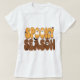 Halloween Retro vivia t-shirt com a frase "Spooky Season". Pequenos fantasmas, um crânio, e alguns morcegos complementam a frase