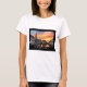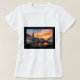 Linda fotografia cênica do pôr do sol nos prédios da frente d'água em Hamburgo, Alemanha. Limite preto com sobreposição de texto.