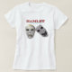 Para lustres do teatro. Título do Hamlet de Shakespeare no vermelho brilhante com máscaras do drama abaixo. Uma máscara cobre um crânio com o arreganho dos dentes e de um olho.