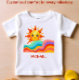 Personalized cheerful and vibrant summer baby t-shirt. It features a friendly smiling sun peeking over a series of colorful, flowing rainbow waves in a hand-drawn style. This charming piece makes a perfect gift for a boho-themed baby shower or a first birthday celebration.