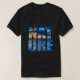Camiseta preta masculina com texto de fundo fotográfico que diz "Viver em harmonia com a natureza".
