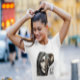 Uma mulher se posiciona graciosamente com um elefante delicadamente equilibrado em sua cabeça. O grande animal confia nela completamente, mostrando uma ligação rara entre espécies. Apenas uma mãe que ama elefantes
