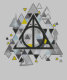 Veja este símbolo geométrico chamado de Deathly Hallow, rodeado por cinzas, amarelo e triângulos azuis.