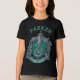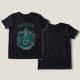 Embrace your child's ambitious side with this bold custom Slytherin t-shirt! The design features the iconic green house crest complete with the serpentine emblem, knight’s helmet, and decorative swirling mantling on a sleek black background. Personalized with your little wizard’s name arched in matching green letters above the shield, it is a statement piece for those destined for greatness. Whether exploring the dungeons or just showing off school spirit, this shirt captures the pride of Hogwarts' most cunning house.