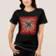 Um design de camiseta ousado e enérgico com a palavra "HIP HOP" repetiu várias vezes em vários tamanhos e orientações. As palavras estão dispostas em um padrão de vórtice giratório, criando um efeito dinâmico e visualmente marcante. O uso de tons contrastantes de vermelho e branco adiciona profundidade e intensidade ao design.