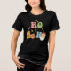 Ho Ho Groovy Feliz Natal As T-Shirts femininas apresentam o texto festivo colorido "Ho Ho" na tipografia moderna, acentuado por estrelas, canetas doces, bolas de discoteca e Papais noeis. Perfeito para o Natal e feriados/ Criado por feriados Evco www.zazzle.com/store/evcoholidays