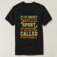 Hockey Versus Futebol T-shirt mostra textos de amarelo e ouro e dois bastões de hóquei. Este jogador de hóquei lê: "Se o Hóquei no Gelo fosse um esporte fácil, seria chamado de futebol!"