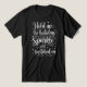 This fun Christmas T-shirt features the playful holiday quote “Hold up, the holiday sparkle just switched on” in a whimsical white cursive font on a black background.