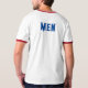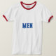 Texto ou Nome Homens ou Palavra com Texto de Cor Azul Profundo e O Estilo é Camisa-T de Ringer Básica, o Tipo de Cor é Branco/Vermelho e o Tipo de Tamanho é Adulto L.