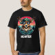 Uma ilustração humorística de um veado vestido de caçador, misturando charme de floresta com uma reviravolta brincalhona. O veado veste uma jaqueta e um boné de camuflagem, completos com óculos escuros refletores, dando-lhe uma aparência legal e aventureira. Personalize esta camisa com o seu nome no verso. Altere ou remova a palavra Hunter, se desejar.
