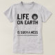 Cinzas de camiseta com gráficos pretos e "LIFE ON EARTH É TÃO MESS QUE ELA ENCHE NOSSOS CORAÇÕES COM DOR E RESISTÊNCIA" com o logotipo I-BONE LTD. Há aqueles que acreditam que merecem ter a parte de leão de tudo, deixando todos os outros com o pouco que resta. Muitos são afetados por uma ganância tão extrema que faz com que usem mal o nosso planeta de uma forma muito abusiva. Em breve, a nossa casa terrestre será um lugar inabitável. Esta forma de ganância é um tipo raro de loucura.