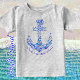 Design náutica cúbica com uma âncora de Kedge. A forma da âncora é composta por uma variedade de figuras divertidas do oceano, incluindo peixes do sol, lula, polvo, rodas do navio, âncoras, lagostas e caranguejos. As figuras do oceano são vários tons de azul. Embaixo da âncora do barco estão as palavras: Nome ama Ilha Jekyll.