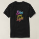 A imagem apresenta o slogan de uplifting "Shine your Light" em fontes brilhantes e coloridas. O texto é exibido numa combinação de tipografia ousada e elegante, criando um impacto visual impressionante. Um gradiente de cores vibrantes, incluindo o néon rosa, azul elétrico, amarelo brilhante e roxo radiante, dá às letras um efeito luminoso. O design inclui uma sutil sombra ou contorno, melhorando a visibilidade tanto em fundos escuros quanto claros. O aspecto geral é dinâmico, elevador e visualmente impressionante, perfeito para camisetas de qualquer cor.