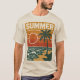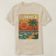 Uma ilustração ao estilo da safra apresenta riscas laranja e vermelhas, um grande sol, ondas oceânicas, praia arenosa e uma palmeira sob a palavra SUMMER em negrito texto negro