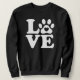 Um design de texto de amor em branco para amantes de cachorro! Este design apresenta uma pata de cão com um coração cortado no meio. Mostrada aqui em uma camisa preta, de suor feminino. Personalize-o com sua própria mensagem e redimensione o design, se quiser. É uma maneira divertida de mostrar o quanto você ama seus cachorros! Sei que amo os meus três!