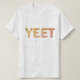 The T-shirt showcases the word "YEET" in large, block letters with a grey, metallic finish. Each letter is accented with small, silver screws at the corners, giving it a rugged, industrial look. The design is simple yet striking, making a bold statement without being overly complicated.