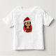 Design com uma ilustração de uma menina feliz sorridente com cabelo comprido e castanho, ela está vestindo a fantasia vermelha e branca do Papai Noel e segurando um presente; feriados de Natal com fundo branco