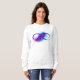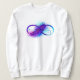 Símbolo infinito com uma bela pena pintada em cores roxas e azuis brilhantes sobre fundo branco.
