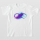 Símbolo infinito com uma bela pena pintada em cores roxas e azuis brilhantes sobre fundo branco.