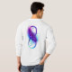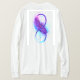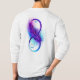 Símbolo infinito com uma bela pena pintada em cores roxas e azuis brilhantes sobre fundo branco.