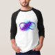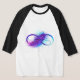 Símbolo do infinito com uma bela pena pintada em cores vibrantes roxas e azuis sobre um fundo branco.
