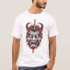 Uma ilustração impressionante e moderna de uma máscara ameaçadora de Oni, inspirada pelo tradicional folclore japonês. A máscara apresenta uma expressão feroz com presas afiadas e grandes olhos redondos que emitem um brilho feroz. Padrões girando como chamas ou fumaça cercam os olhos, aumentando a intensidade da máscara. A paleta de cores consiste em tons negros de vermelho, preto e branco, com sotaques dourados acentuando os intrincados detalhes. A máscara é enfeitada com chifres curvos, e um objeto vertical semelhante a espada percorre seu centro, adicionando sua presença imponente. O estilo geral da ilustração é gráfico e dinâmico, criando um poderoso impacto visual que capta a essência da mitologia Oni