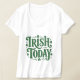 Bold, decorative kelly-green lettering spells Irish Today in stacked vintage serif type with playful swashes and geometric accents. Shamrocks and dotted flourishes frame the words, forming a balanced badge that feels retro, festive, and proudly Irish.