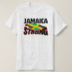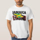Jamaica Forte. Esta imagem vibrante grita "JAMAICA STRONG" em estilo ousado e espirituoso. "JAMAICA" se orgulha de preto, enquanto "STRONG" se dimensiona em vermelho com um contorno preto marcante. O fundo é a icônica bandeira jamaicana, espertamente em forma de ilha, com uma cruz amarela dividindo triângulos verdes e negros. É como se a própria ilha estivesse flexionando seus músculos! Esta design é um tributo vivo e sincero ao orgulho jamaicano e à resiliência, perfeita para quem ama a cultura e o espírito vibrantes da Jamaica. 🇯 🇲 💪 🎉