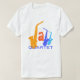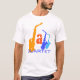 Saxofones coloridos (harmonia laranja e azul) como letras que formam a palavra "Jazz" + palavra "Quarteto" em azul. Design na camisa branca masculina. Disponível sem a palavra "Quarteto", com o mesmo design a preto, a branco, com camisa impressa em todas as partes e com outro design de saxofonias com saxofonia como letra A.