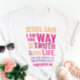 A camiseta cristã com o verso bíblico de João 14:6 Jesus lhe disse, "Eu sou o caminho, a verdade, e a vida. Ninguém pode vir ao Pai exceto por mim". Os versos estão em cor laranja vermelha e rosada e em caligrafia mista e tipografia minimalista. Esta moda, design de fé moderna é a dádiva perfeita e a declaração de moda. #cristão #religião #escritura #fé #bíblia #jesus