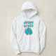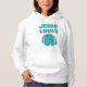 Este capuz feminino tem uma mão azul com um dedo apontador e um contorno de sombra vermelha mostrando as palavras "Jesus ama" em uma impressão ousada com um contorno sombrio correspondente no tema da citação baseada na fé. Este capuz é feito a partir de uma mistura de algodão de 10 oz, capas de 100% de algodão embutidas na face de algodão e furos de agulha dupla e banda inferior para durabilidade extra tem uma imagem correspondente menor impressa no verso.