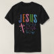 Esta camisa preta apresenta uma cruz cor-de-rosa à esquerda de "O caminho" na escrita roxa, "A Verdade" na escrita rosa, e "A vida" na escrita azul, todos cercados por estrelas brancas. O nome "JESUS" está no topo de uma fonte colorida em bloco com letras azuis, laranja, rosa e verdes. Esta design oferece uma mensagem religiosa.