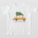 Esta design mostra um carregando de carro amarelo uma árvore de Natal amarrada ao telhado, cercada por flocos de neve caindo. O carro tem manchas de neve sobre ele, somando à confortável vibração do inverno. Abaixo do carro, a frase "jingle all way" está escrita em uma letra manuscrita divertida.
