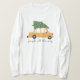 Esta design mostra um carregando de carro amarelo uma árvore de Natal amarrada ao telhado, cercada por flocos de neve caindo. O carro tem manchas de neve sobre ele, somando à confortável vibração do inverno. Abaixo do carro, a frase "jingle all way" está escrita em uma letra manuscrita divertida.