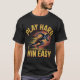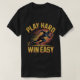 Esta t-shirt preta apresenta o texto "REPRODUZIR DURO" numa fonte amarela em negrito, arquivada no topo, e "WIN EASY" numa fonte vermelha em negrito, arquivada no fundo. No centro está um gráfico dinâmico de um corredor, que parece ser um indivíduo de pele clara, em cheio estriado com linhas de velocidade amarela e vermelha sugerindo movimento. O design é motivacional e orientado para o esporte.