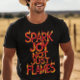 Uma ilustração digital com as palavras "Spark Joy", não apenas as chamas escritas em letras estilizadas de vermelho e laranja que parecem ser feitas de fogo.