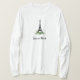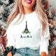 Esta camisa de na moda diz "Joyeux Noël" na tipografia moderna francesa, e tem uma imagem da Torre Eiffel cercada por galhos de pinheiros e cones de pinheiros para um toque de Natal extra. Usamos arte de LABFcreations.
