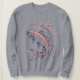 A modern women’s sweatshirt featuring a pink fish splashing through water. Great for stylish anglers and ocean fans.