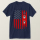 A design apresenta uma angustiada bandeira vertical dos EUA com um caiaque substituindo uma das listras vermelhas. A bandeira é apresentada no esquema tradicional, com o campo azul com estrelas brancas no topo à esquerda e as faixas vermelhas e brancas correndo verticalmente no lado direito do design. Mas uma das listras vermelhas foi substituída por uma imagem de caiaque. O kayak é renderizado em vermelho, então ele se mistura com as outras listras enquanto se destaca como um elemento único. A bandeira em si está angustiada, com as cores que aparecem desbotadas e vestidas e o tecido a aparecer ligeiramente tachado. A combinação da bandeira angustiada com o único elemento kayak cria um olhar vintage e robusto que é patriótico e temático de aventura.